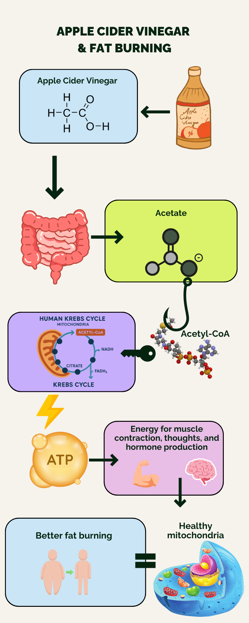 Acetic acid in apple cider vinegar stimulates AMPK, turning up fat oxidation in the mitochondria – not just the fat under your skin, but also deep visceral fat around your organs, which is much harder to get rid of.