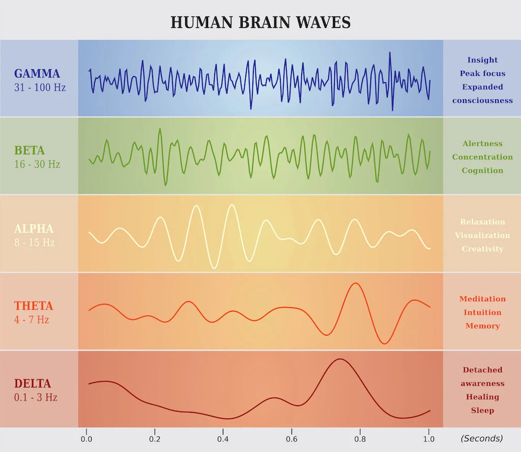 There are five widely recognized brain waves. The brain waves can be measured with EEG. EEG shows how the neurons signal to each other - how high the frequency is.
